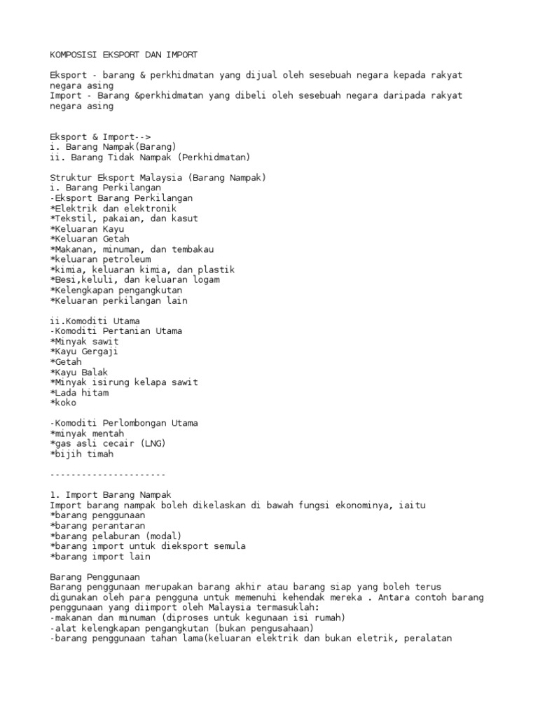 Ekspor adalah barang dan jasa yang diproduksi di satu negara dan dibeli oleh penduduk di negara lain. Benua yang menerima barangan eksport dari malaysia yang paling rendah adalah afrika, dengan kadar 2.2%. Please contact our support to get more information. Komposisi eksport import brg nampak. Kayu minyak gas karet kopi dll.
