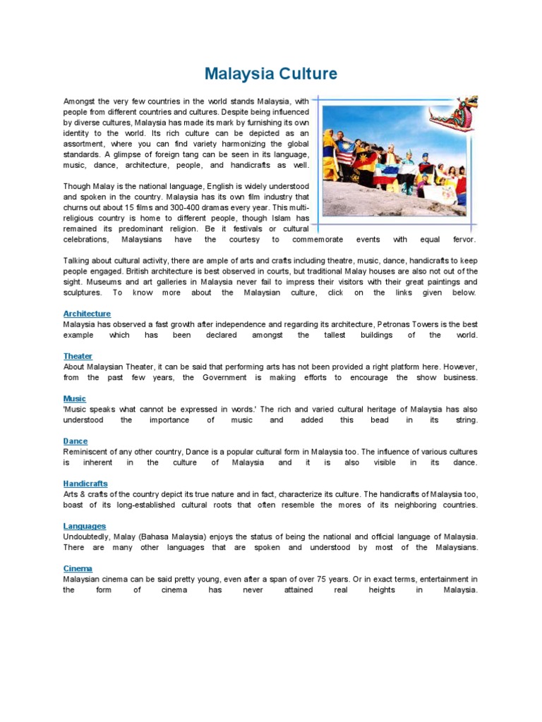 The culture of malaysia is diverse and a melange of influences from both the east and the west. These feelings of shame are commonly felt when an individual loses ' face '. My grandparents fled the communist country to seek a better life in malaysia. Chinese, tamil, telugu, punjabi, thai, and other languages are spoken. The malays' qualities inform their cooking. Malay food is strong, spicy and aromatic, combining the rich tastes of the many herbs and spices commonly found in southeast asia. Racial, religious and cultural harmony are often synonymous with living in singapore and malaysia. Sastera refers to literature in malay, which covers a variety of genres including poetry, myths, folk tales, epics and proverbs. The southernmost parts of thailand; Malay food is strong, spicy and aromatic, combining the rich tastes of the many herbs and spices commonly found in southeast asia. Coastal borneo, including brunei, west kalimantan, and coastal sarawak and sabah, plus the smaller islands that lie between these locations. Malay culture the culture of malay is the way of living of the people of malay. The culture of malaysia draws on the varied cultures of the different people of malaysia.